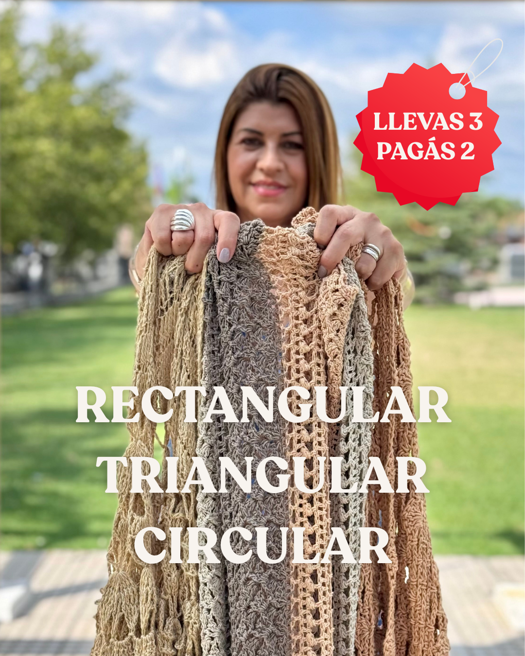 Este combo fue pensado para que explores el mundo de los chales tejidos a crochet desde tres estructuras completamente distintas, ampliando tus recursos técnicos y creativos.