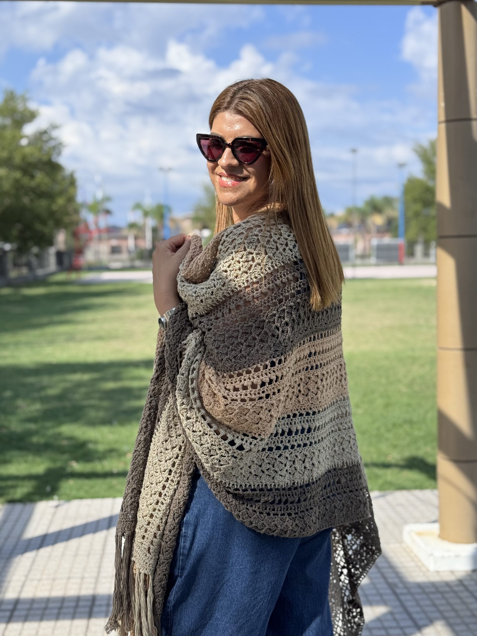 Estructura triangular, liviano y envolvente. Perfecto para lucir sus texturas y puntos calados que acompañan el crecimiento clásico del triángulo. El patrón incluye sus dos versiones en lana con guarda y algodón con flecos.