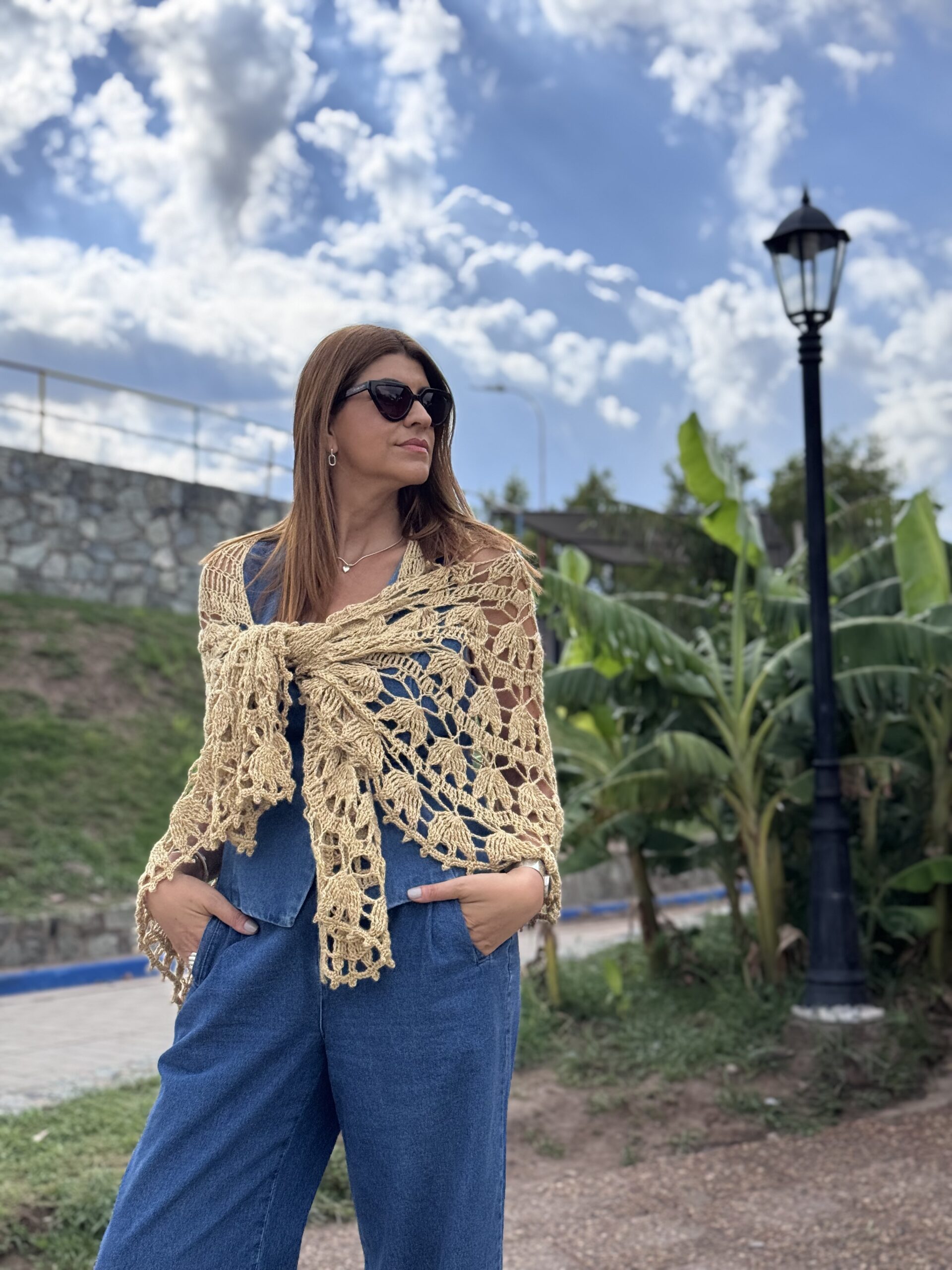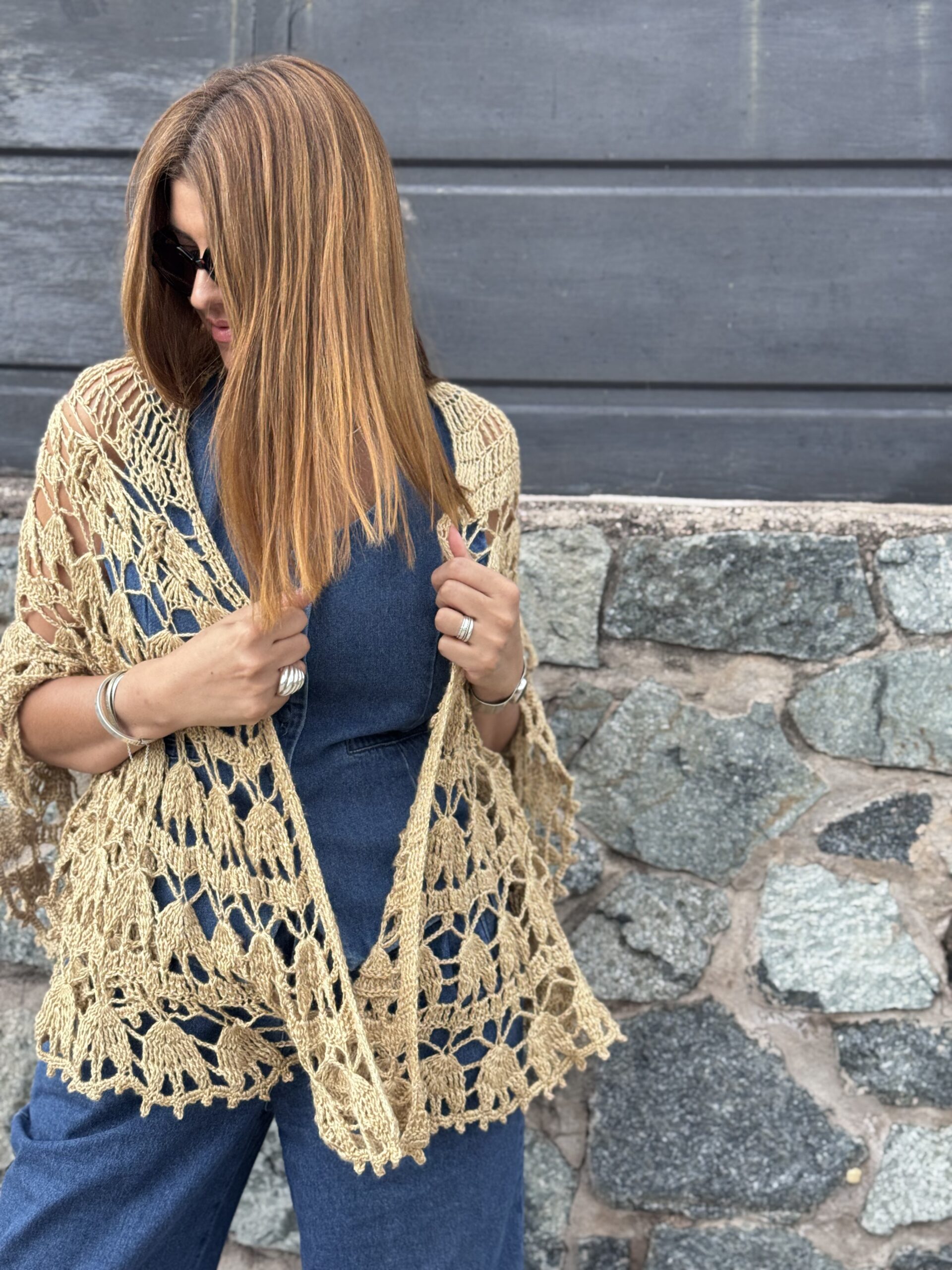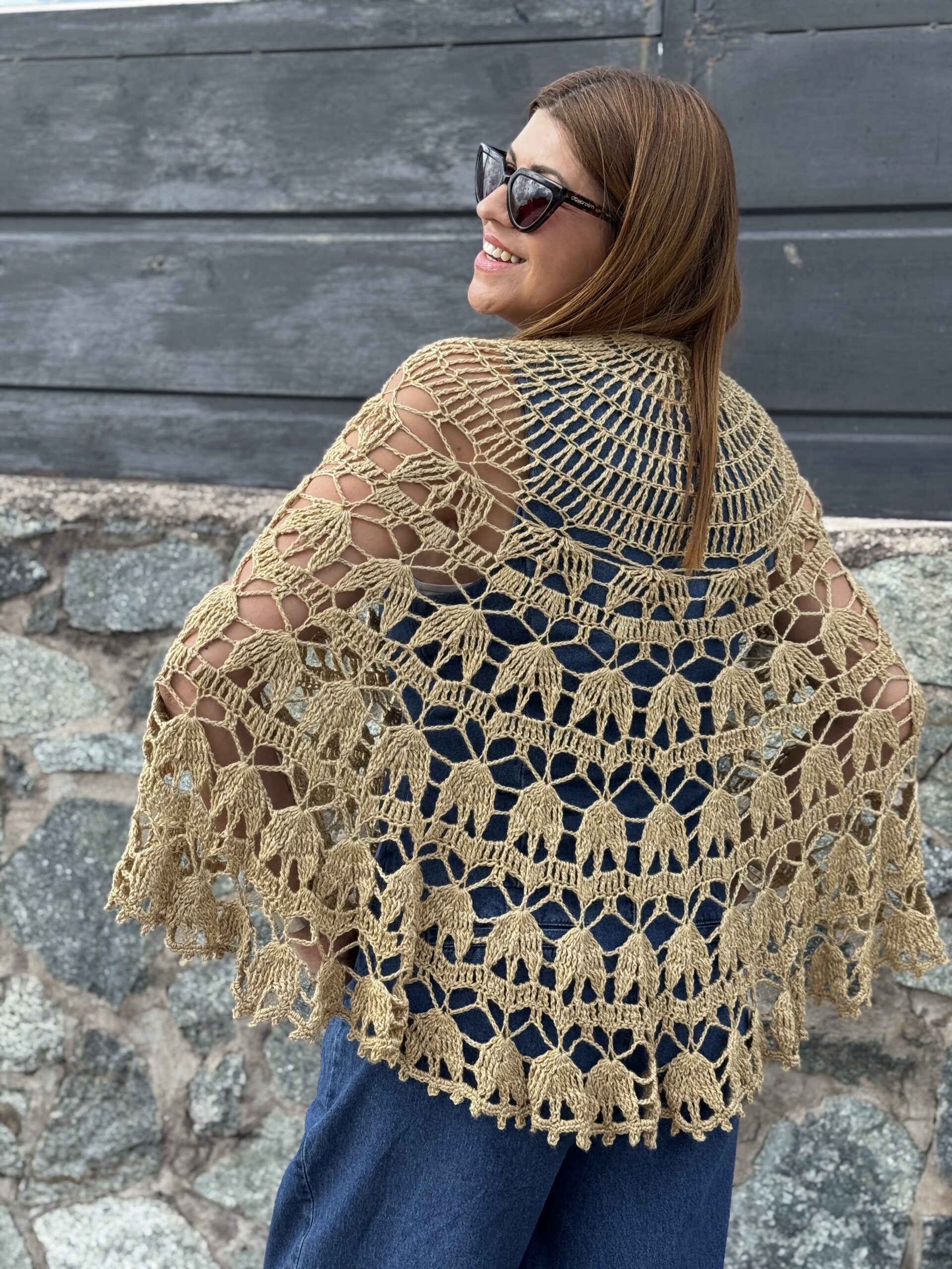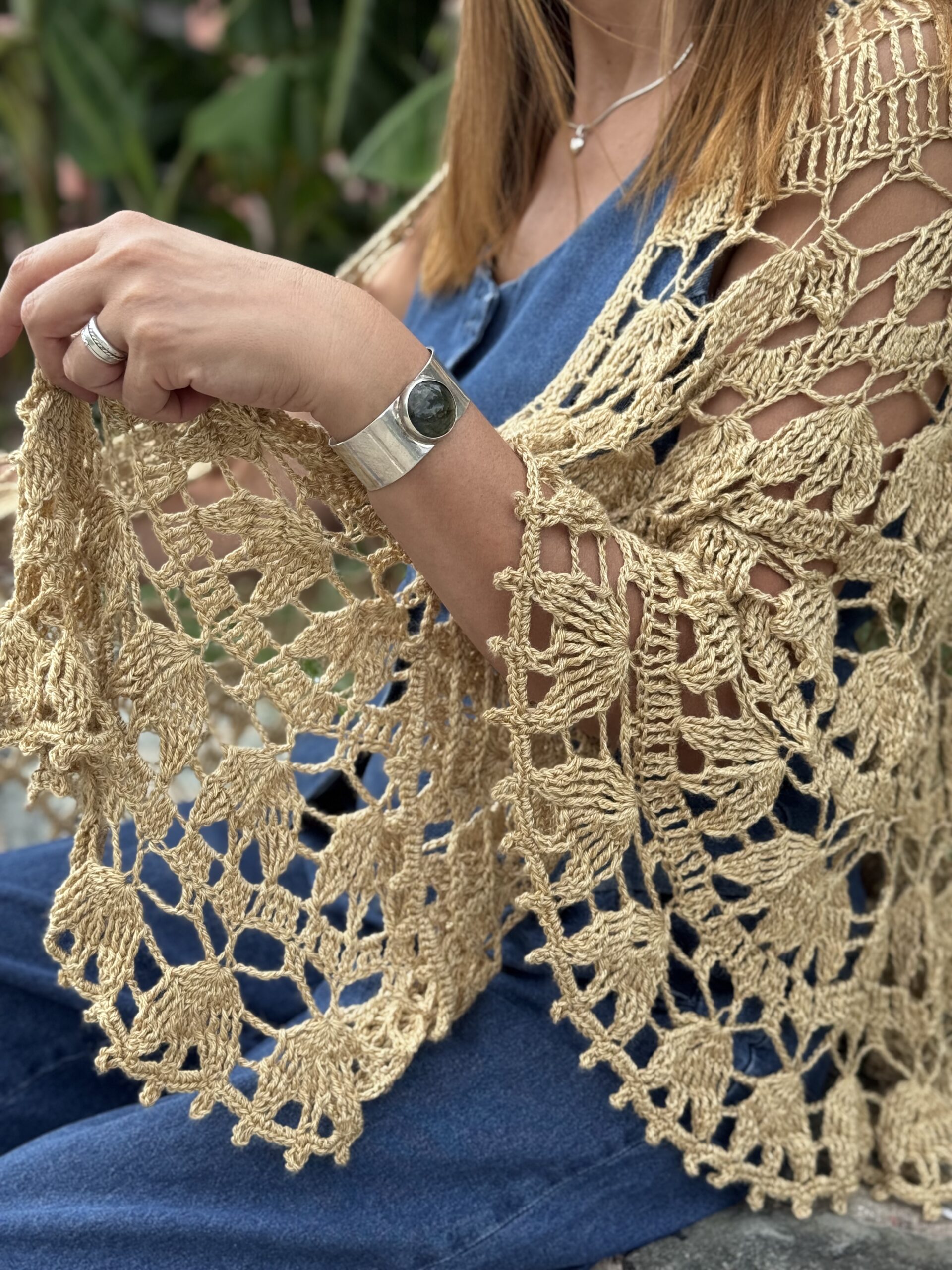 Padma es un chal tejido a crochet de estructura circular, que crece desde el centro hacia afuera, generando una prenda envolvente, equilibrada y con mucho movimiento.